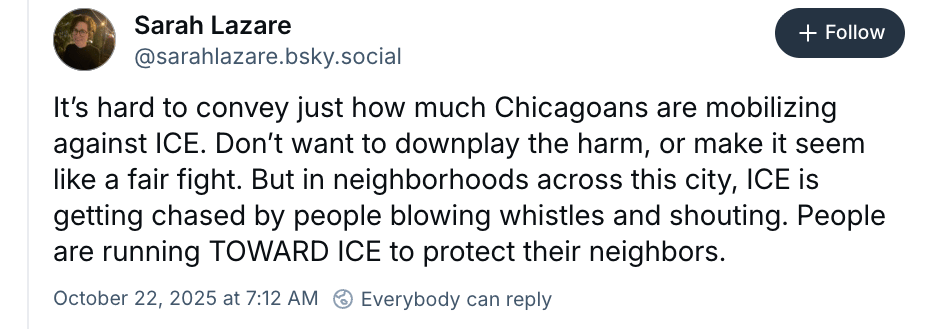 It doesnât matter, because itâs not working â and their own crackdown shows how much pushback they are facing, how much backlash and public vitriol, as community networks scale, and rapid response networks in Chicago now extend into dozens of neighborhoods.When a rapid-response team helps someone evade detention; when a legal clinic saves a case; when community pressure forces transparencyâthese are victories, but they take so much capacity, usually from volunteers, and there is incredible risk, especially when it happens in South and West neighborhoods without the same amount of scrutiny or resources. As Chris said here: if you were out for #NoKings in Chicago, itâs time to join a response team.